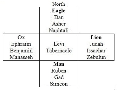 The prophet Ezekiel has a vision of the throne of God. Words cannot express the magnificence he experiences. The living creatures and wheel are described (Hebrews 8:5). Ezekiel sees angelic beings of a lion, ox, man and eagle. They are four mascots of four tribes of Israel: Judah, Ephraim, Ruben, Dan (Genesis 49:1-2, Numbers 2:2-3, 10, 18, 25). The tabernacle curtains at the Holy of Holies were purple, red, white and blue (Exodus 26:1). The high priest's robe has twelve gemstones of the twelve tribes (Exodus 28:21). The Gospels depict four themes of Jesus Christ: King, Servant, Son of Man, Son of God. Symbols in the Bible reveal prophecy.